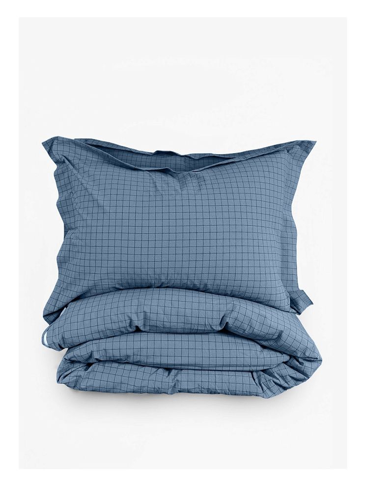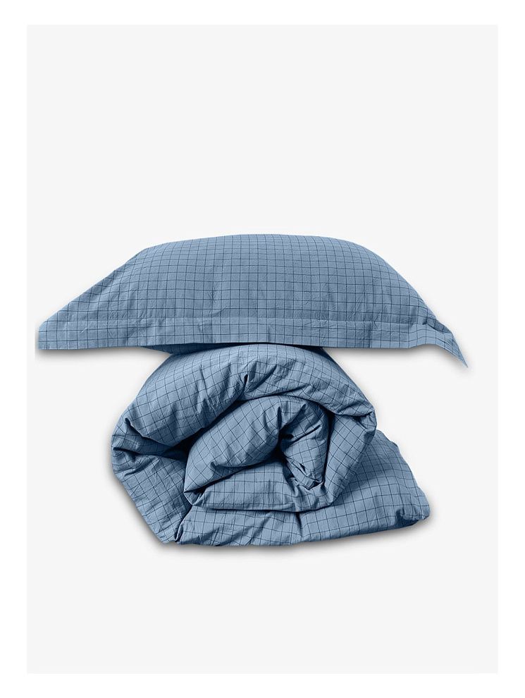 Семейный комплект постельного белья LOFT Dark Blue Cell из вареного хлопка. Прекрасный вариант для любителей стиля casual. Ткань во время производства в буквальном смысле проходит обработку горячей водой с добавлением вулканической породы. Такое белье отлично дышит и испаряет влагу в теплую погоду, а мягкая поверхность создает ощущение уюта.